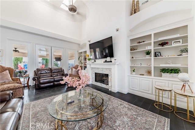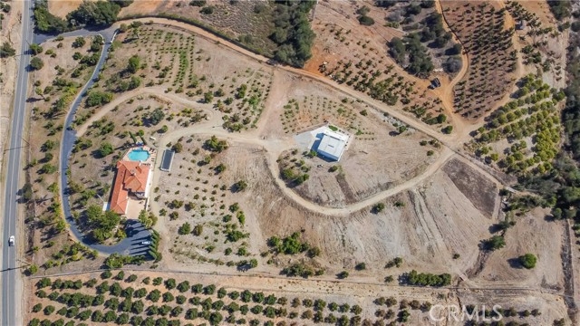 The home spans over 3,000 square feet of refined living space, beginning with a grand entry framed by soaring 20-foot ceilings and flooded with natural light. The great room showcases Italian-inspired architectural columns, custom built-ins, and an elegant fireplace that sets the tone for the rest of the residence. The gourmet kitchen is designed for both function and entertaining, featuring a large island with 6-burner cooktop, granite countertops, custom cabinetry, double convection ovens, abundant storage, and an effortless flow into the dining and family room areas. Living is easy on the main floor thanks to a spacious primary suite complete with dual walk-in closets, his-and-hers sinks, a vanity, oversized soaking tub, and a large walk-in shower. French doors open directly to the backyard, providing seamless access to the resort-style pool, heated spa, and covered outdoor entertaining area with wet bar and sink. The downstairs also includes a versatile 4th bedroom or office with French doors. Upstairs, two expansive bedroom suites each offer private balconies with sweeping vistas of the surrounding groves and hills. The grounds offer endless possibilities—gentle terrain ideal for vineyards, additional orchards, future guest house construction, or a sports court. A steel workshop/RV barn with electricity, oversized three-car garage, excellent security system, central vacuum, and extensive parking for 12+ vehicles round out this exceptional property. This is more than a home—it is a rare hilltop sanctuary blending luxury, privacy, natural beauty, and agricultural potential into one extraordinary offering.
