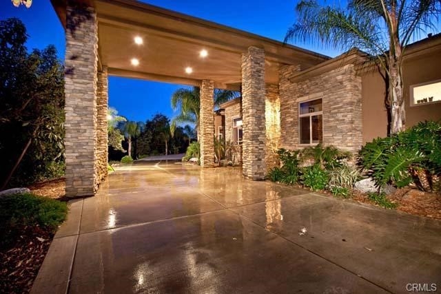 Modern gated estate in coveted DeLuz community. Nestled on nearly 19 acres, this extraordinary hilltop estate features two homes, an irresistible outdoor oasis, and truly panoramic views of the countryside. Approx. 4700 sq. ft., the luxurious main residence has 3 bedrooms, 5.5 baths, and a versatile home office. Main floor master suite includes a fireplace, large jetted tub, double steam shower, two vanities, a full laundry room, & French doors that access the pool deck. Impressive open concept floor plan encompasses the living room with fireplace, a game room, and an elegant dining room with convenient butler’s pantry. Enviable kitchen includes top-quality appliances, center island, walk-in pantry, & breakfast nook. Huge upstairs bonus room with full bath offers a balcony with great views. Amenities: handsome architectural details; gracious entry with 14-ft. ceilings; full-size wet bar with ice maker & wine fridge; granite counters; alder wood cabinetry throughout; 2nd full-size laundry room; bamboo & Italian porcelain flooring; ceiling fans; central vacuum; security system; fully-paid solar system; 4-car garage. Enjoy park-like grounds, a pebble-finish saltwater pool and spa, outdoor shower, covered patio, mature landscaping, fruit trees, & magnificent ancient oaks. Finished in the same architectural style, the 3 bedroom, 2 bath guest house approx. 1800 sq. ft. offers a great room, full kitchen, laundry room, view balcony, a 3- car garage plus RV garage. No HOA.