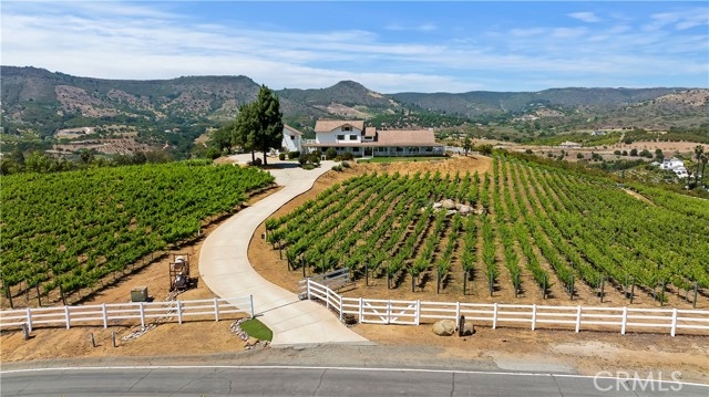 Updated Modern Farmhouse on over 5 1/2 acres on your own private vineyard with amazing panoramic views! Located in prestigious De Luz! Relax in a rocking chair on your front porch while enjoying views of your private vineyard and sunset! Views from almost every room! Main home features 4 bedrooms, plus office, 4 baths with high valued wood beam ceilings and an open floorpan. Light and bright kitchen with a huge quartz island, sub zero refrigerator and freezer, Decor stove with double ovens, wine refrigerator, and walk-in pantry. Great for entertaining! Huge primary suite with private balcony, walk-in closet with built-ins, spacious bathroom with walk-in shower, separate soaking tub, his and her vanities and toilets. Two of the secondary bedrooms feature an en-suite. Separate private studio suite above the garage with private bath, kitchenette and views! Upgrades throughout! Large rear yard with room for a pool. 4-car garage with epoxy floors, electric car charging, built-in cabinets and work bench. Plenty of additional space for toys or RV Parking, sports courts or to add another garage. Great location...approximately 12 minutes from the freeway, shopping and Old Town Temecula! Be to San Diego or Orange County in an hour! Make an offer!! One of the lowest price per sqft in De Luz!