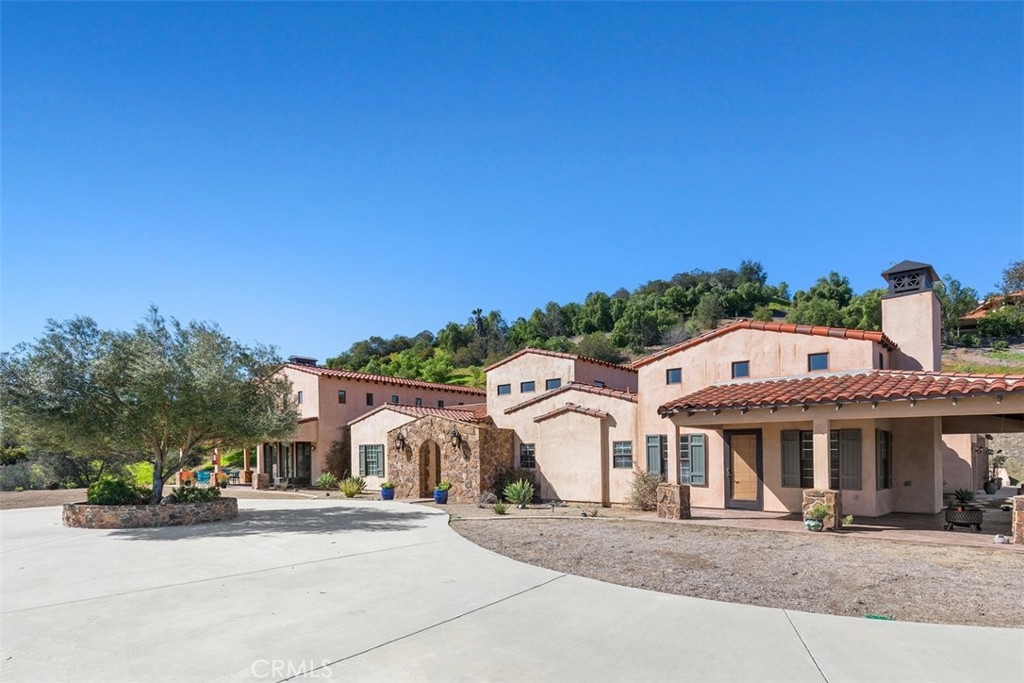 Tuscan style estate home with courtyard entrance and wrap around verandas. Enter through the stylish stone courtyard, featuring a fountain, into a formal entry with 14-foot ceilings accentuated with solid wood beams, 8-inch baseboards, crown molding and views to rear veranda with a wood burning fireplace. The 5-foot-wide hallway leads to a massive great room and Chef’s kitchen featuring 24-foot vaulted ceilings with hand hewn wood beams, Cherry Wood cabinetry, and wood burning fireplace with raised stone-faced hearth. Entertaining in the great room is enhanced by the ability to bring in the outside by way of the 6 pairs of French doors leading to the wrap-around veranda with ceiling fans. The main kitchen features a 6 burner Thermador cooktop with indoor grill, Viking hood, built-in Kitchenaid refrigerator/freezer and matching Kitchenaid appliances. The adjoining butlers kitchen also features top of the line appliances with a wine cooler and is adjacent to the oversized walk-in pantry. The vast dining room is perfect for entertaining. Guests can enjoy meals next to the crackling of the wood burning fireplace with views to the rear yard. Master bedroom features a wood burning fireplace, exterior door to covered veranda, comfortable retreat area with coffee bar and built-in beverage cooler. The master bath has a jetted tub, luxurious shower, double sinks, vanity, travertine floors and marble countertops. Guest bedrooms have private baths that also include marble countertops. The office provides extensive space for a private get-away or you may want to convert it to a game room. The house was designed with structural integrity and energy efficiency in mind. Energy efficiency is accomplished by a majority of the exterior walls being 12-inches thick with added insulation, dual air conditioning units and double glazed windows. Construction methods include structural steel throughout and 12 inch I beams supported by 3 ½ foot deep grade beams (See Supplements). The 4-car garage has ample space for all of your toys. If your desire is to have an additional barn or guest house there is an area just below the main building pad that is level enough to allow for horses, a car barn, or guest house.