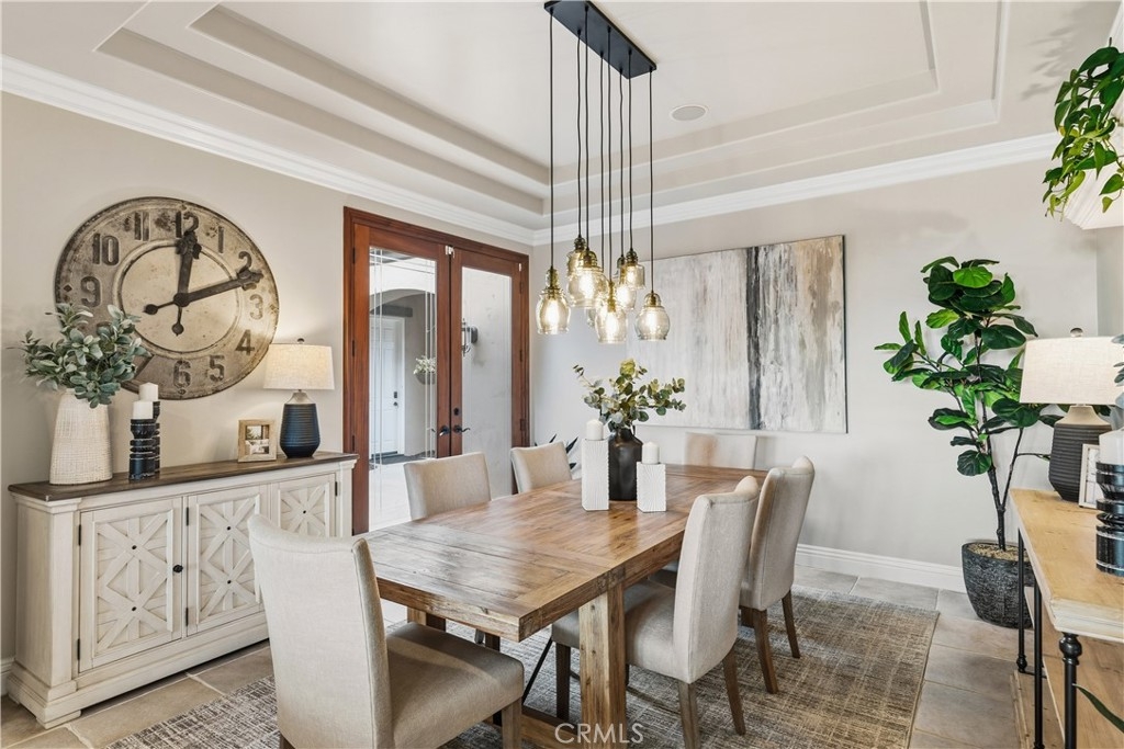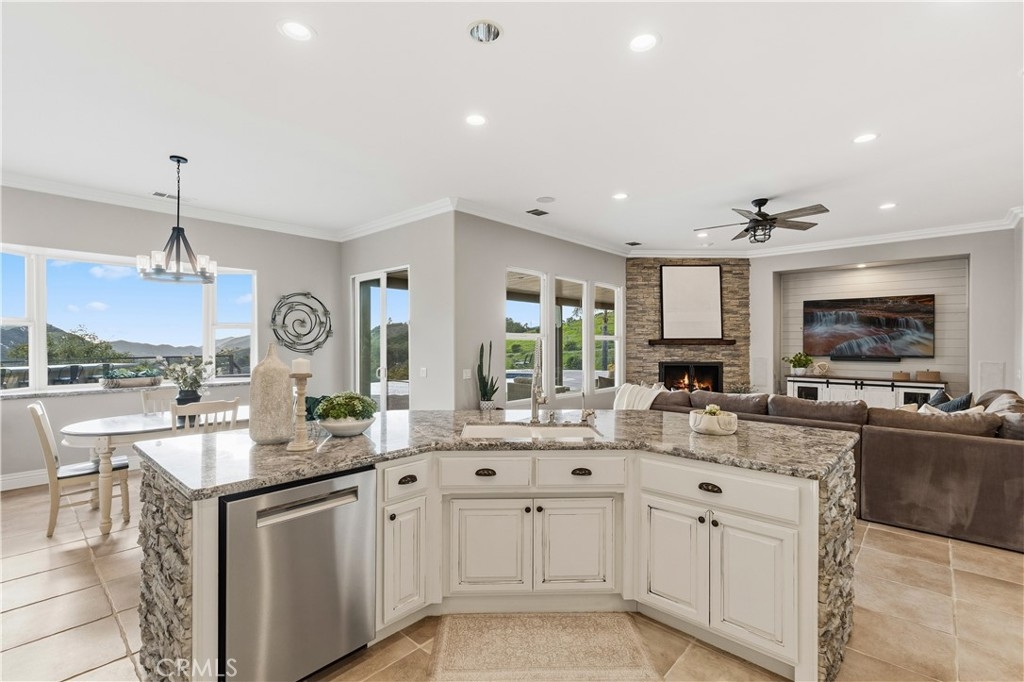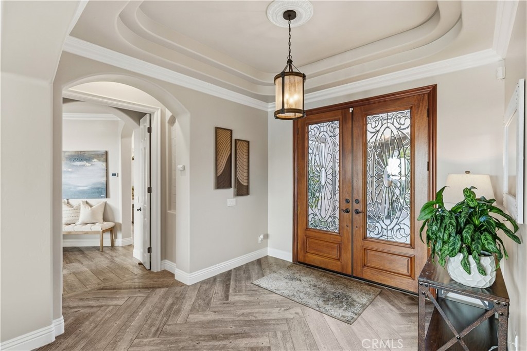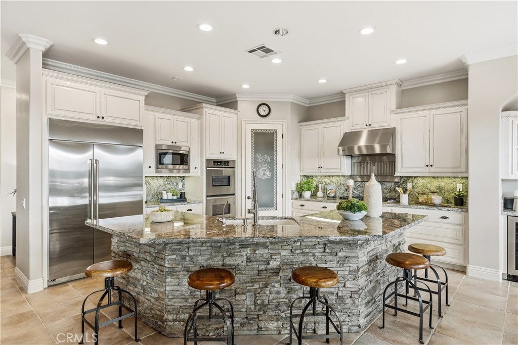 A palm-lined paved driveway leads to a charming courtyard and oversized leaded double doors opening to a light-filled, open floor plan designed for entertaining. Interior features include new interior paint, crown molding, smooth hand-textured walls, graded baseboards, ceiling fans, exterior electric window shades, and carpeted bedrooms. Formal living and dining rooms flow into a welcoming family room with fireplace and a gourmet kitchen featuring a six-burner Viking stove, double KitchenAid ovens, quartz countertops, Bosch dishwasher, walk-in pantry, built-in buffet with wine refrigerator, breakfast bar, and eat-in dining area.