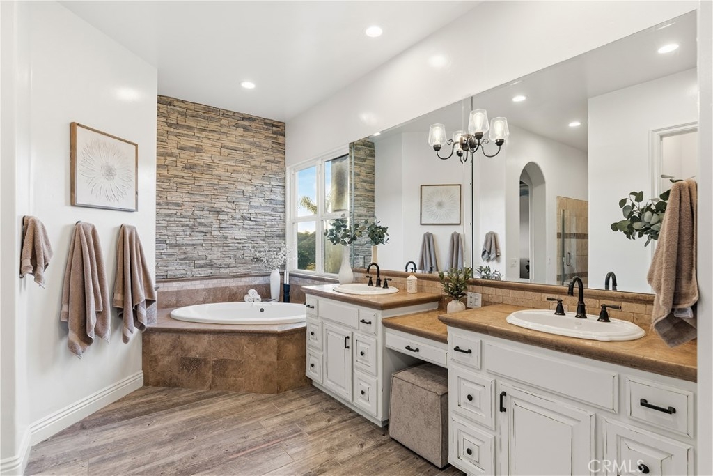 The primary suite is a private retreat offering a walk-in closet, spa-style bath with dual sinks, vanity, jetted tub, walk-in shower, and a private office located just off the suite. Two guest bedrooms share a Jack-and-Jill bathroom with dual sinks, providing comfort and functionality.