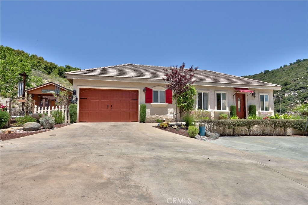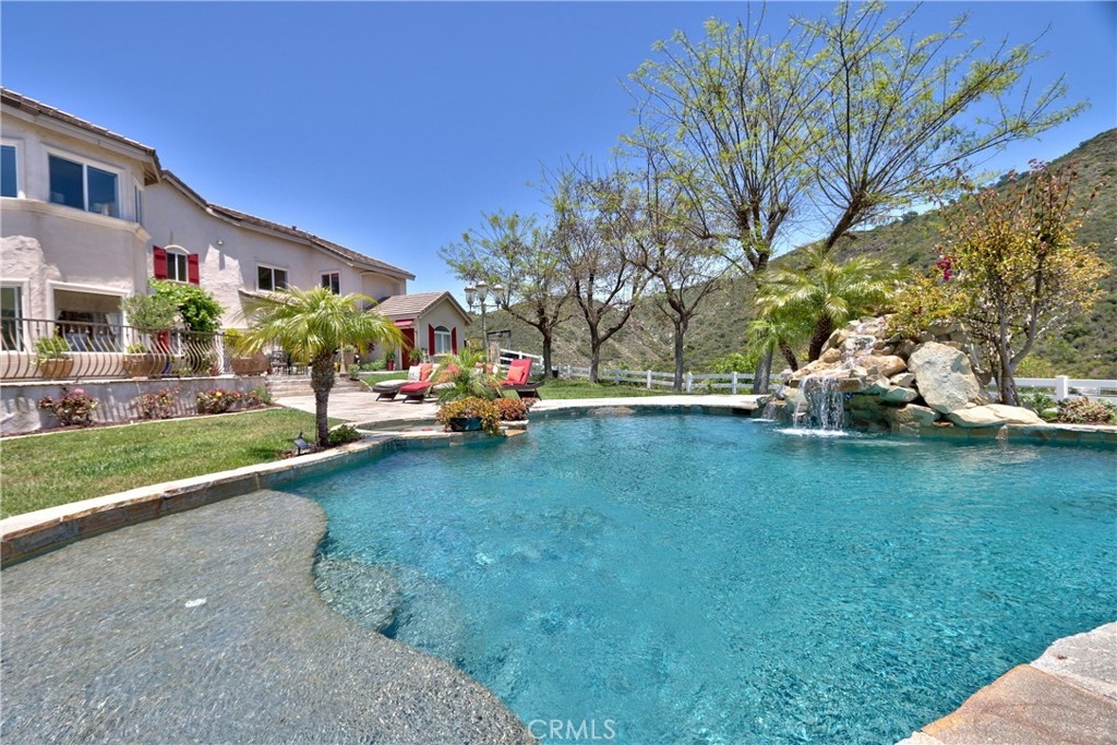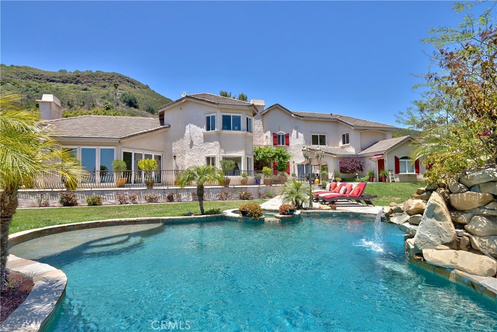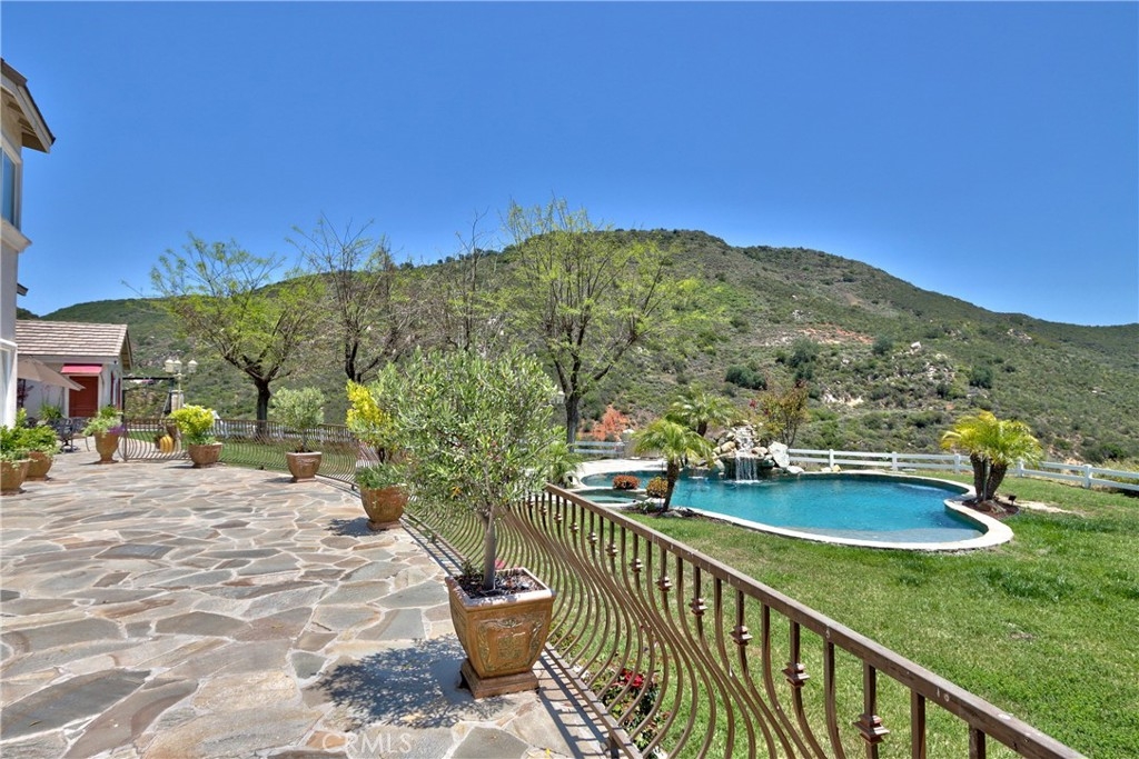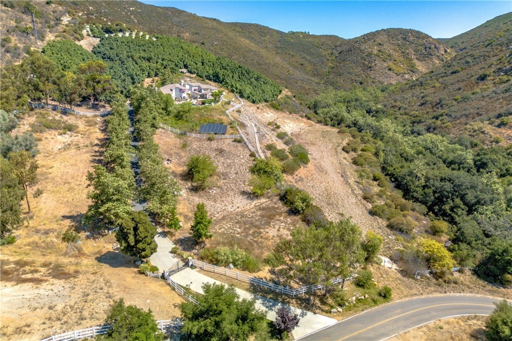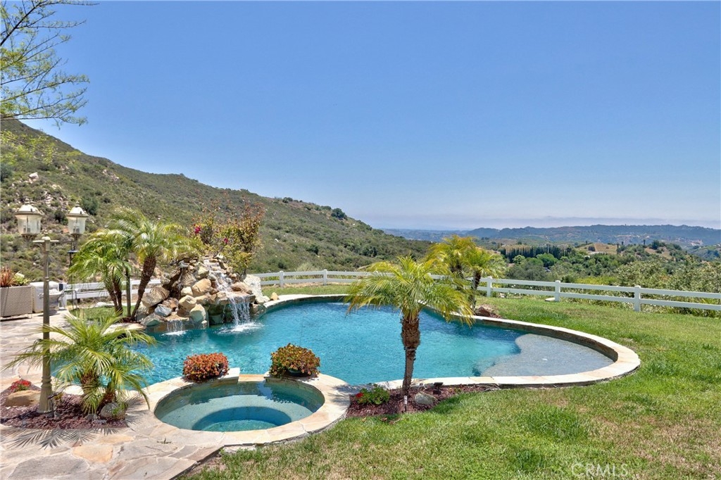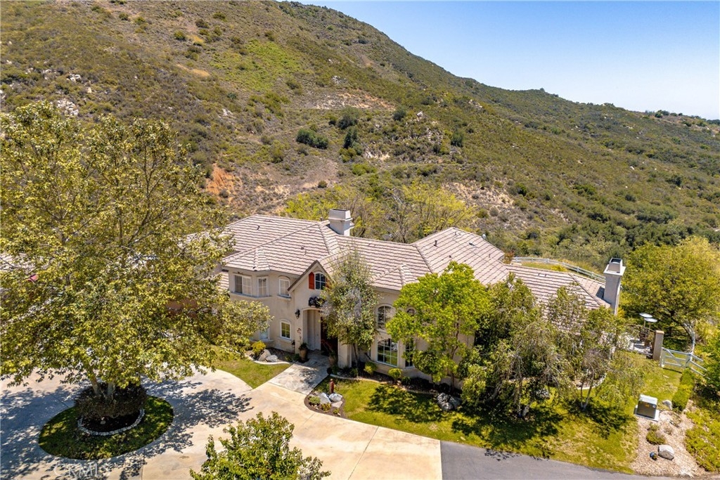 Secluded private De Luz estate, but still close to town. This custom-built French Country masterpiece spans 5,919 square feet, offering 7 Bedrooms and 5.5 Bathrooms in the main house which includes Butler's quarters. There is also a 1,263 square foot 2BR/1BA guest home with a one car attached garage. Elegance welcomes you with dual primary suites - one on each level - providing comfort and seclusion. Each suite boasts sitting areas, walk-in closets, and en suite bathrooms with his-and-hers sinks. Outdoor access graces both, while the upstairs suite enjoys a Juliet balcony. Throughout, engineered birch wood floors echo elegance, complementing beamed ceilings, a wine closet, and a music room/den. The kitchen boasts granite counters, custom cabrinetry, and a six-burner range. A wine fridge, dual ovens, oversize island with a vegetable sink and warming drawer, spacious custom refrigerator, dual dishwashers, and a breakfast bar with double door opening onto the patio make it a culinary haven. The family room enchants with high beam truss celings and a wood-burning fireplace. Oversized windows and accordion doors connect indoors and out, revealing a pool and spa oasis. Downstairs features an extra bedroom, full and half bathrooms. Upstairs, 5 bedrooms and 3 bathrooms await, including that second primary suite. That 5th room has its own entrance with an exterior spiral staircase, an efficiency kitchen, and attached bath - idea for staff or rental. The guest house, 1,263 sq. ft, offers 2BR/1BA. Handicap accessible, it features a kitchen, living room, separate laundry, and 1-car garage. Outdoors - a pool, waterfall, space, built-in BBQ, cooktop, and picturesque backdrop. Notably, professionally managed Avocado grove with 800-/+ trees adds to the allure. In summary, this De Luz gem melds equisite architecture with modern comforts. Discover refined living and create cherished memories in this exceptional residence.