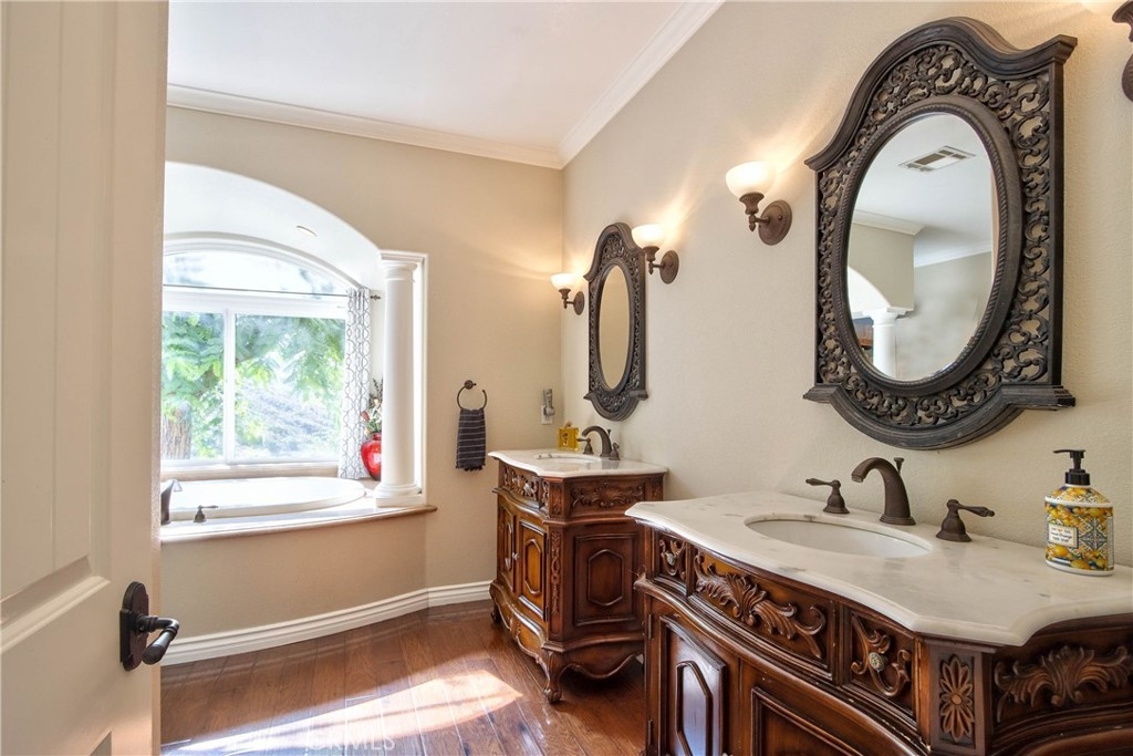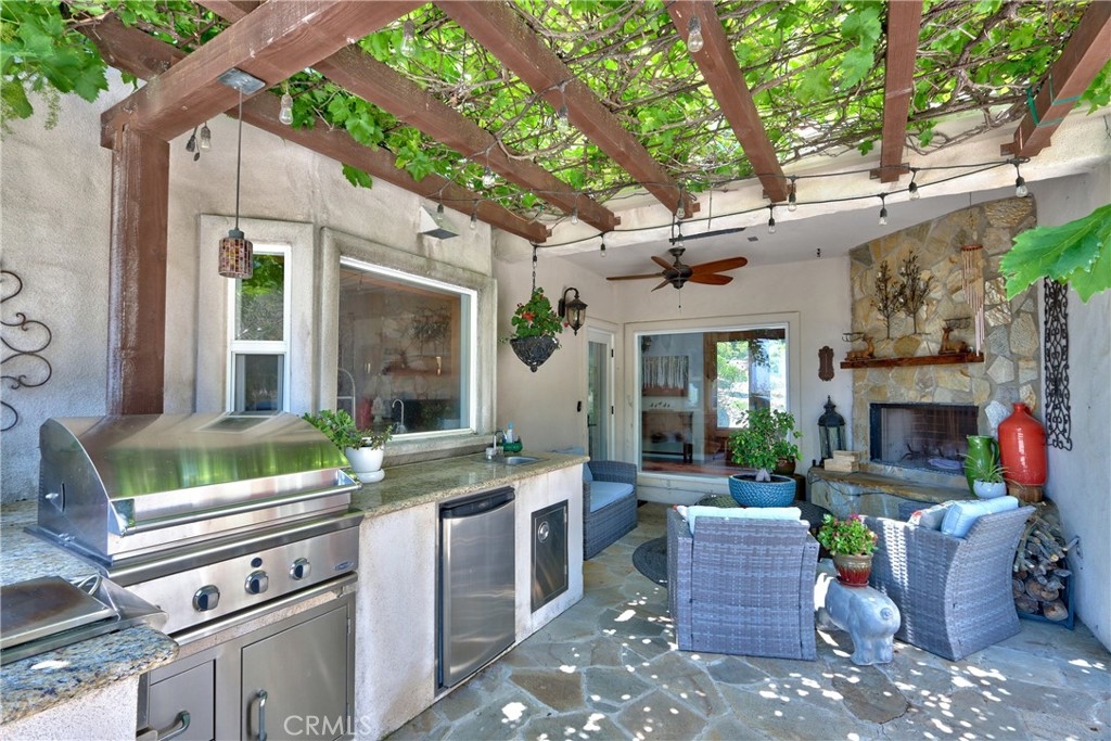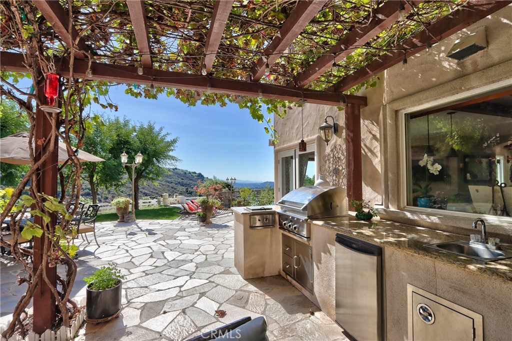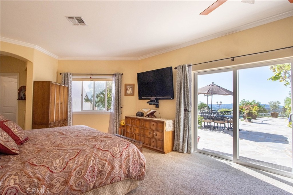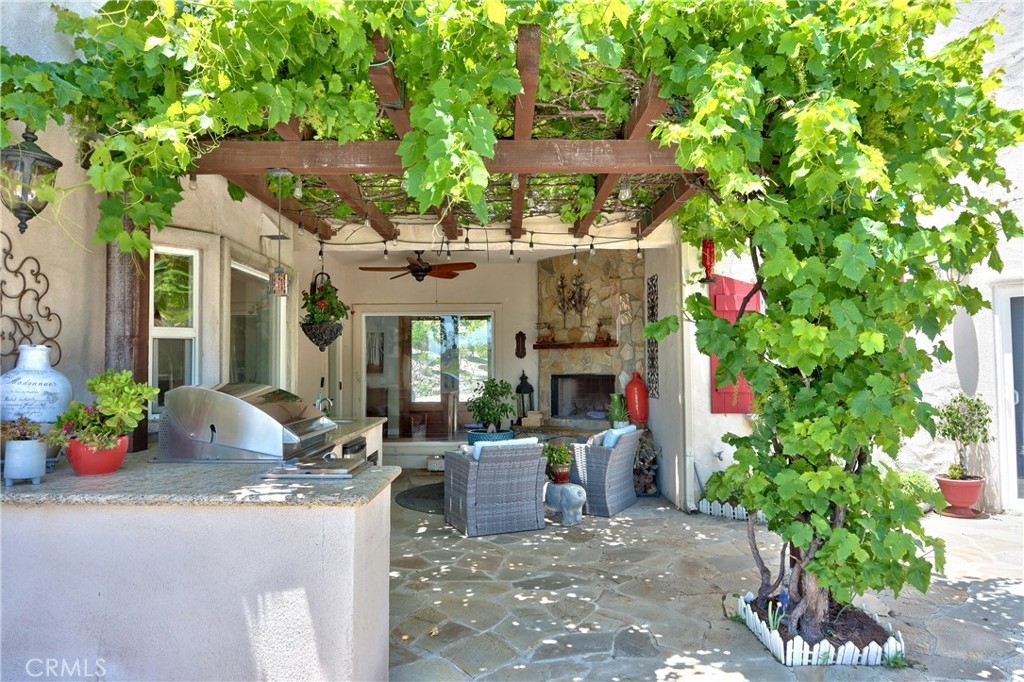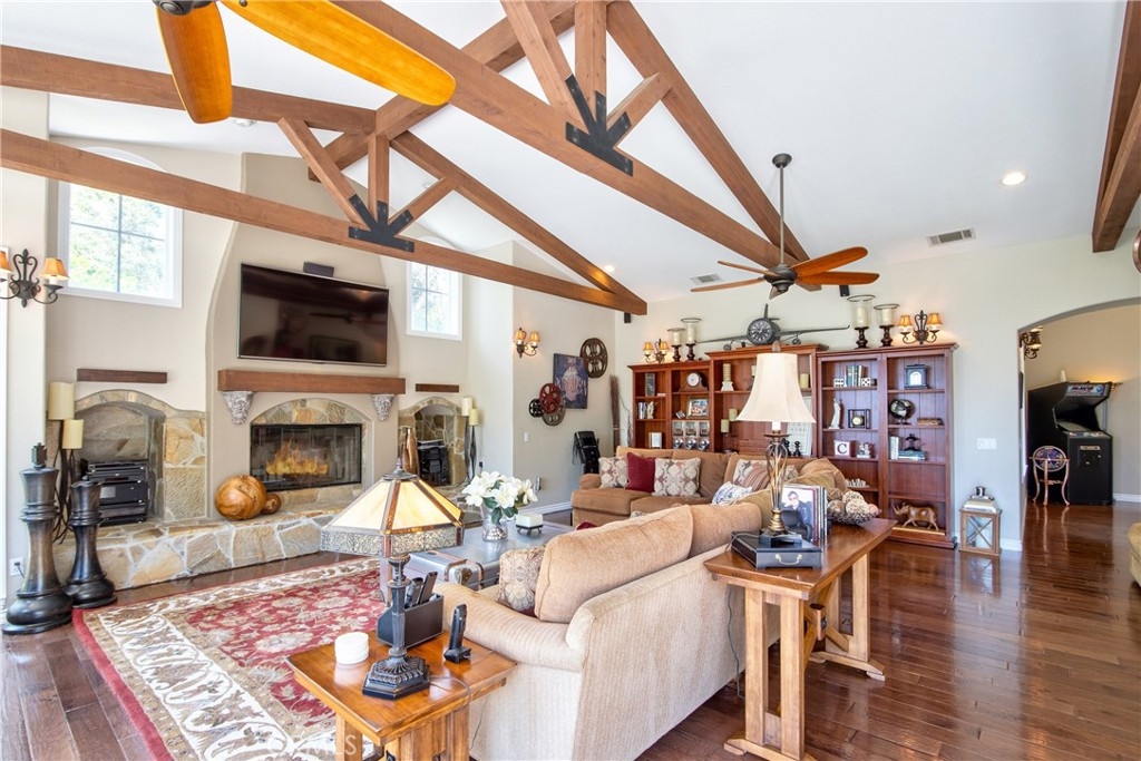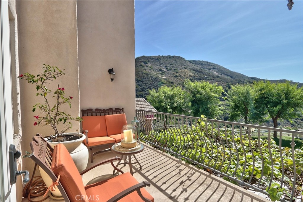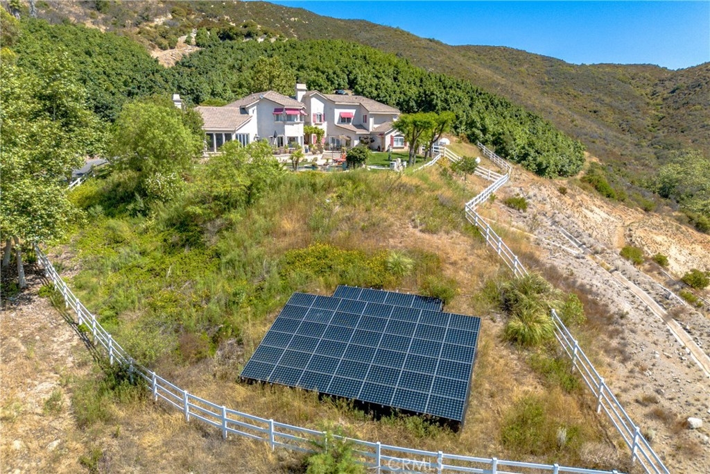 Secluded private De Luz estate, but still close to town. This custom-built French Country masterpiece spans 5,919 square feet, offering 7 Bedrooms and 5.5 Bathrooms in the main house which includes Butler's quarters. There is also a 1,263 square foot 2BR/1BA guest home with a one car attached garage. Elegance welcomes you with dual primary suites - one on each level - providing comfort and seclusion. Each suite boasts sitting areas, walk-in closets, and en suite bathrooms with his-and-hers sinks. Outdoor access graces both, while the upstairs suite enjoys a Juliet balcony. Throughout, engineered birch wood floors echo elegance, complementing beamed ceilings, a wine closet, and a music room/den. The kitchen boasts granite counters, custom cabrinetry, and a six-burner range. A wine fridge, dual ovens, oversize island with a vegetable sink and warming drawer, spacious custom refrigerator, dual dishwashers, and a breakfast bar with double door opening onto the patio make it a culinary haven. The family room enchants with high beam truss celings and a wood-burning fireplace. Oversized windows and accordion doors connect indoors and out, revealing a pool and spa oasis. Downstairs features an extra bedroom, full and half bathrooms. Upstairs, 5 bedrooms and 3 bathrooms await, including that second primary suite. That 5th room has its own entrance with an exterior spiral staircase, an efficiency kitchen, and attached bath - idea for staff or rental. The guest house, 1,263 sq. ft, offers 2BR/1BA. Handicap accessible, it features a kitchen, living room, separate laundry, and 1-car garage. Outdoors - a pool, waterfall, space, built-in BBQ, cooktop, and picturesque backdrop. Notably, professionally managed Avocado grove with 800-/+ trees adds to the allure. In summary, this De Luz gem melds equisite architecture with modern comforts. Discover refined living and create cherished memories in this exceptional residence.