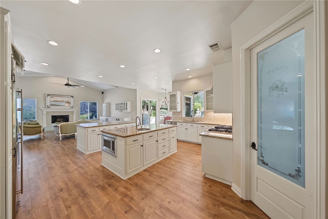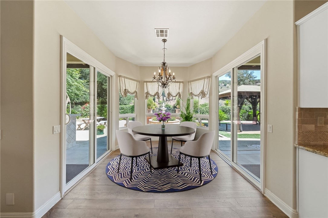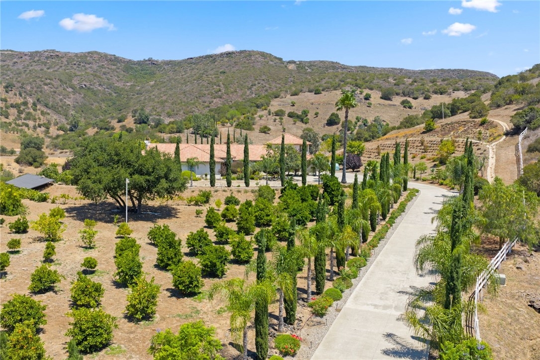 This Magnificient Mediterranean Estate is located in the prestigious are of De Luz - often called Millionaire's Row - Adjacent to the Santa Rosa Plateau and just 10 minutes from Interstate 15! Very Private - Located on approximately 11 acres of gentle land, with numerous fruit trees and flowers, fenced garden areas, chicken coop, and perfect ara to plant additional vineyards, citrus, for Equestrian uses, and plenty of room for tennis or pickleball courts! Entering the elegant property through the gated entrance, up the gently curving driveway lined by roses, you will be happy to be home! The open floor plan has approximately 4,530 square feet, with 4 bedrooms plus an office that could be converted to a bedroom by constructing a closet, and 3 1/2 baths on the main floor, plus a large office/gym/theatre room upstairs, with a 3/4 bathroom with shower upstairs! The over sized 1,800 sf - 4 car garage plus workshop area, offers room for any vehicle, and plenty of storage - plus there are 2 separate 200 amp, 3 phase electrical panels with 220 v. outlets throughout the garage. The newer Solar system will reduce your electric costs substantially! The gourmet kitchen offers double granite islands, Profession Chef's appliances equipped with built-in Thermador and GE Monogram stainless appliances, huge walk-in pantry, separate breakfast nook with views, and is open to the Family Room with vaulted ceilings and fireplace. The Handmade tumbled marble mural backsplash and cast stone moldings accentuate the vineyard theme! The Primary Bedroom, which is downstairs, includes two walk-in closets, large vanity, Jacuzzi tub, and large walk-in shower. and the other bedrooms offer large closets and adjacent bathroons. The outdoor kitchen/BBQ is a perfect area for enjoying the evening sunsets. There is an oversized Laundry Room plus Utility Room which offer so much extra storage! Additional features: Whole house central vacuum, completely wired for Cat 5 high speed networking.